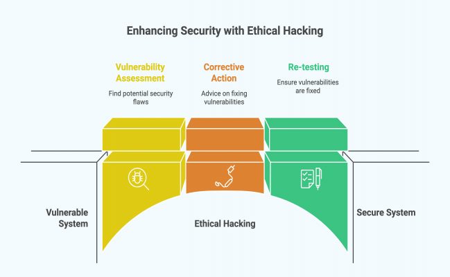The organisation receives a report of the found vulnerabilities by an ethical hacker. They also offer advice on corrective action. The ethical hacker frequently conducts a re-test with the organisation’s approval to make sure the vulnerabilities are completely fixed.